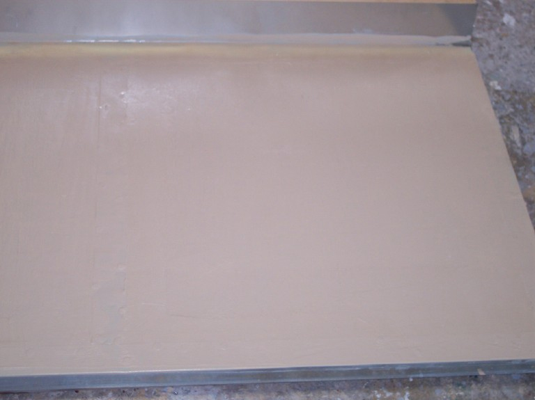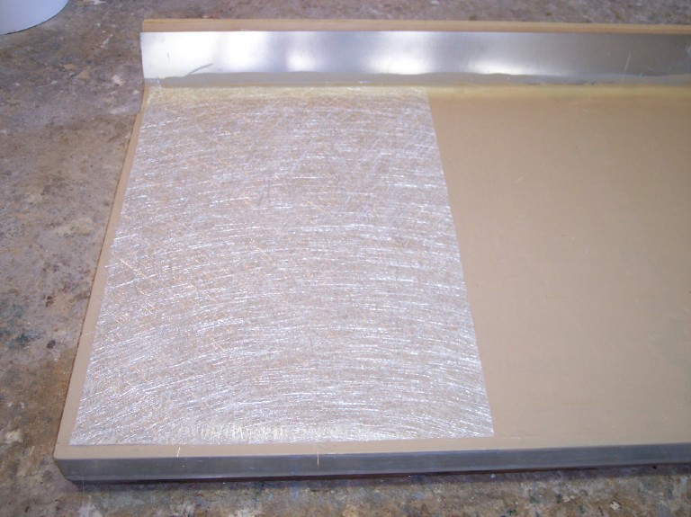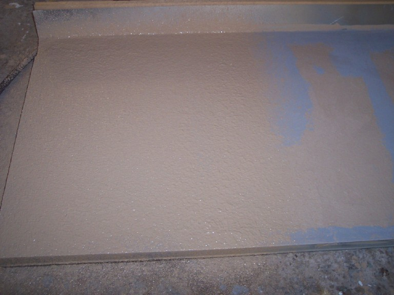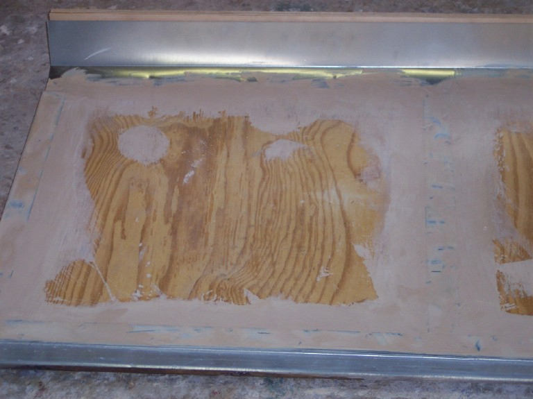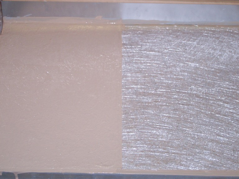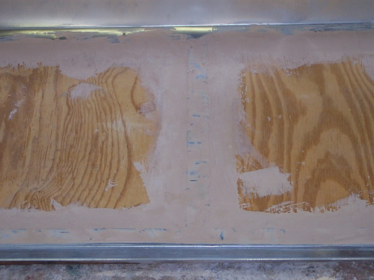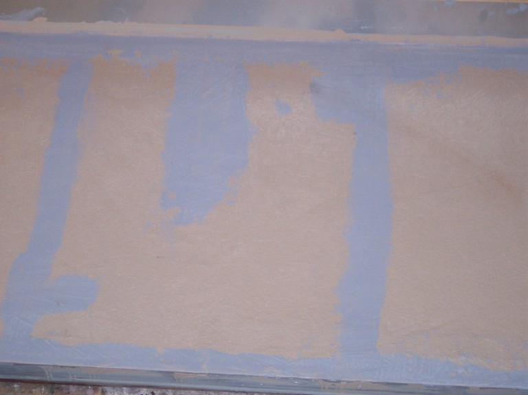 Apply patching compound to all deck perimeter edges and all glass seams where the fiberglass edges butt. Apply patch over metal seams again if they show through the fiberglass mat. Make all repairs and corrections to provide for the smoothest deck surface before applying texture coat. A different colored patch was used in the photos for contrast to highlight the areas of the 2nd deck preparation.