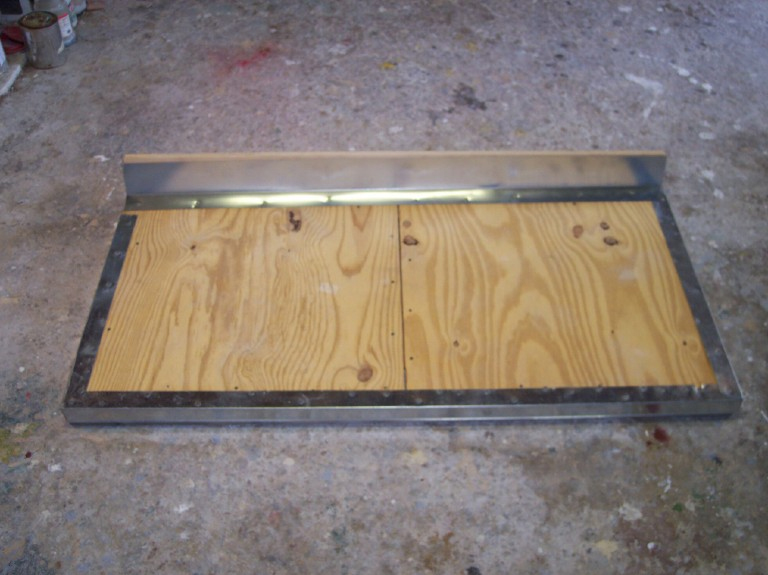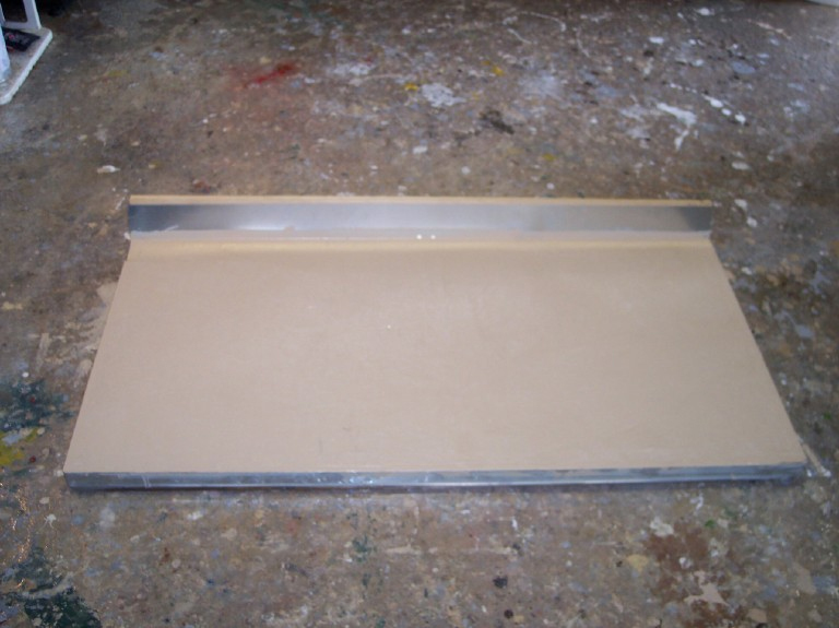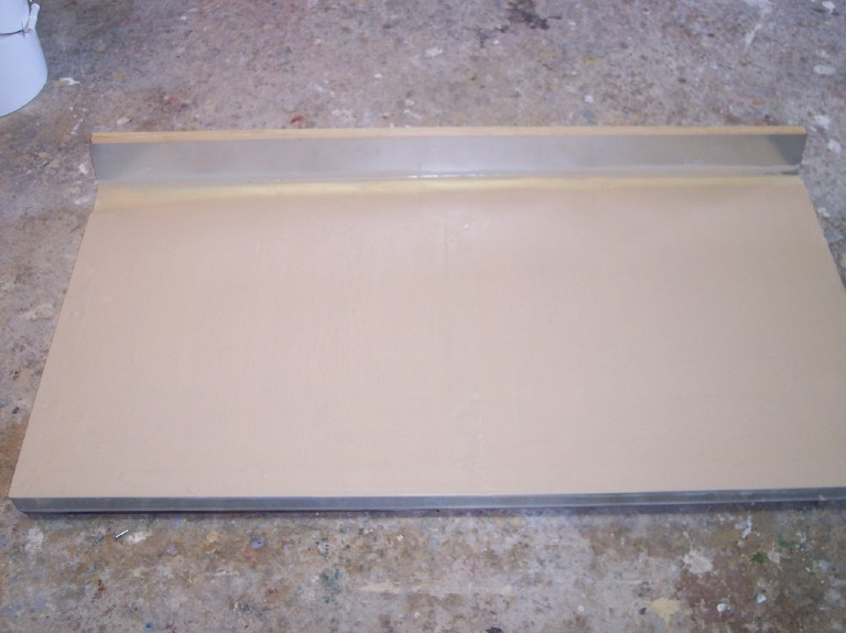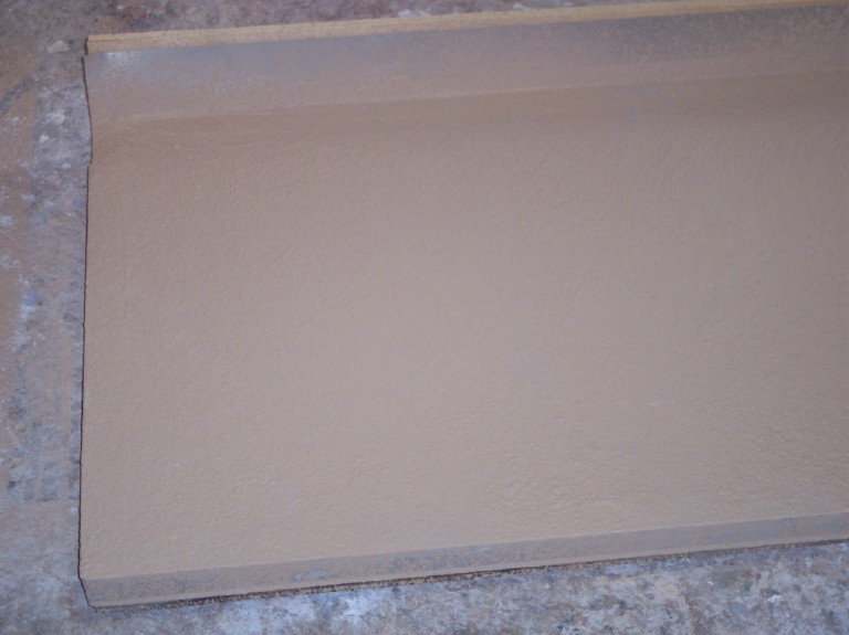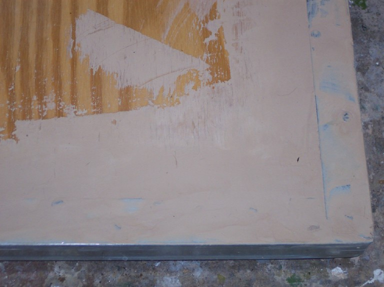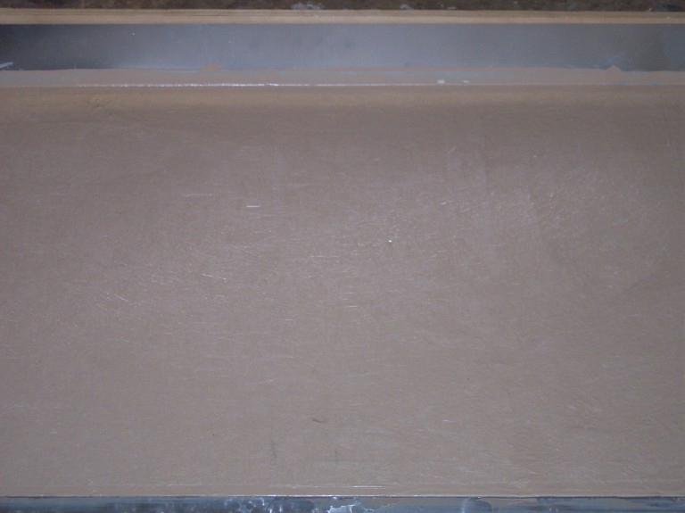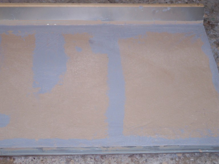Apply patching compound to all deck perimeter edges and all glass seams where the fiberglass edges butt. Apply patch over metal seams again if they show through the fiberglass mat. Make all repairs and corrections to provide for the smoothest deck surface before applying texture coat. A different colored patch was used in the photos for contrast to highlight the areas of the 2nd deck preparation.